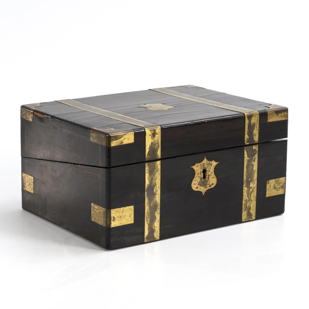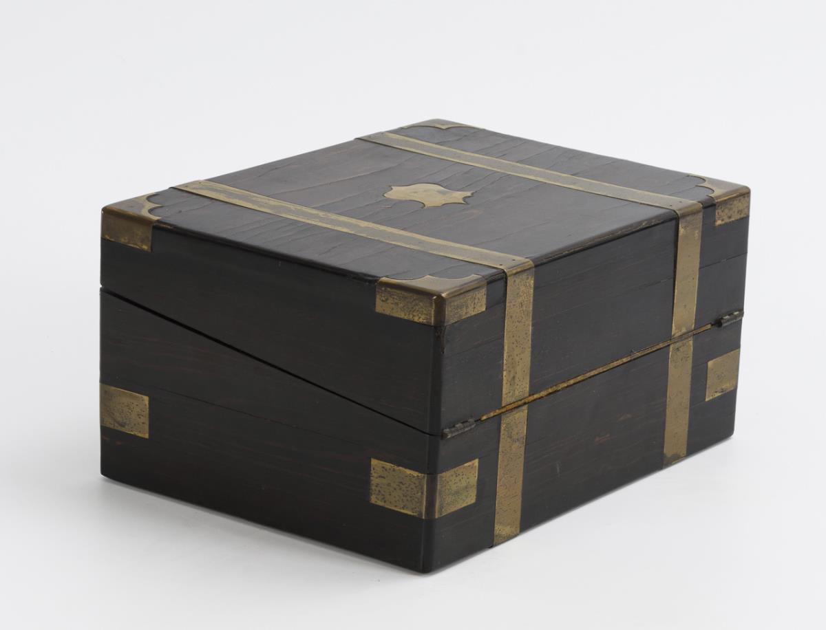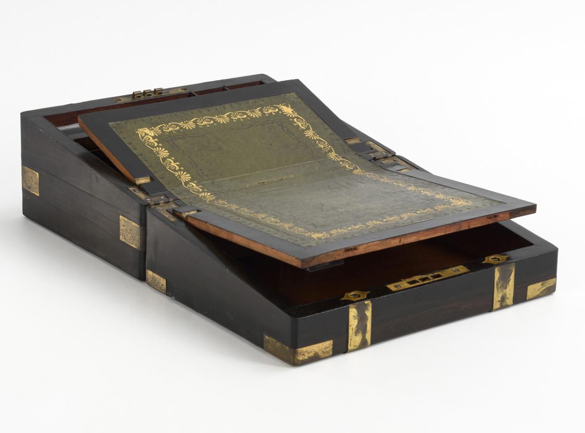 Ebony(?) veneered with brass inlays, solid mahogany, green leather with gold embossing. 16 x 30 x 23 cm (closed).