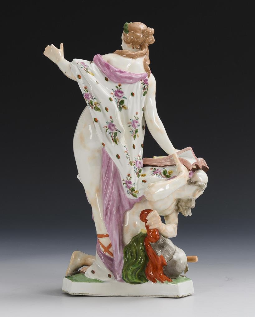 Standing figure of the goddess of glory, Fama, leaning on the god of time, Chronos, kneeling on her right. Fire crack in the base, 2 restorations on the edge of the base, foot and scythe of Chronos and bow on the cape of Fama restored, shawm and left hand of Fama bumped.
