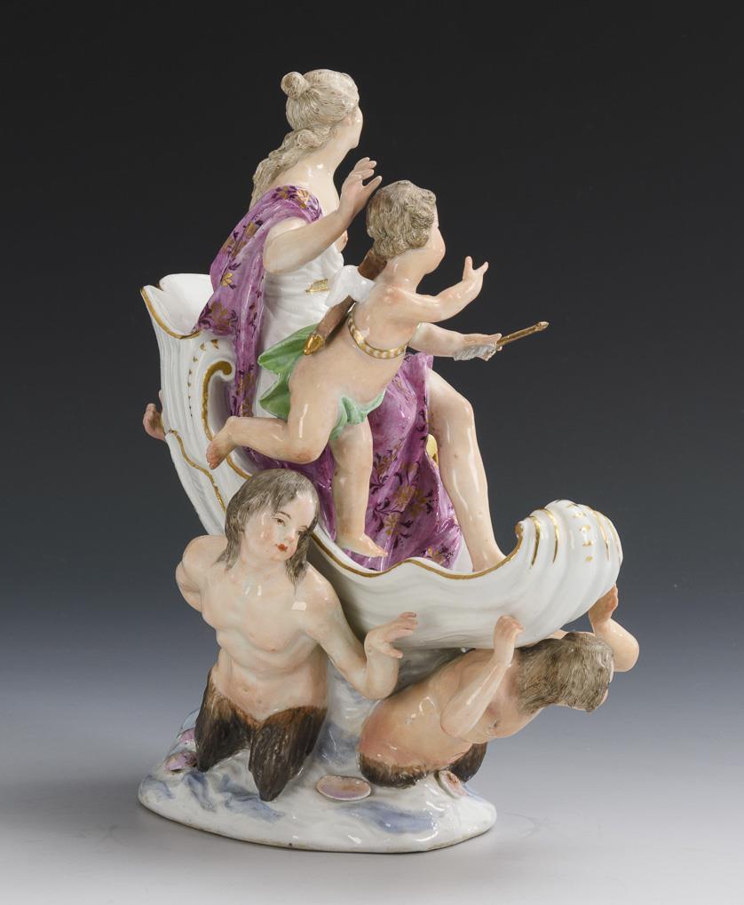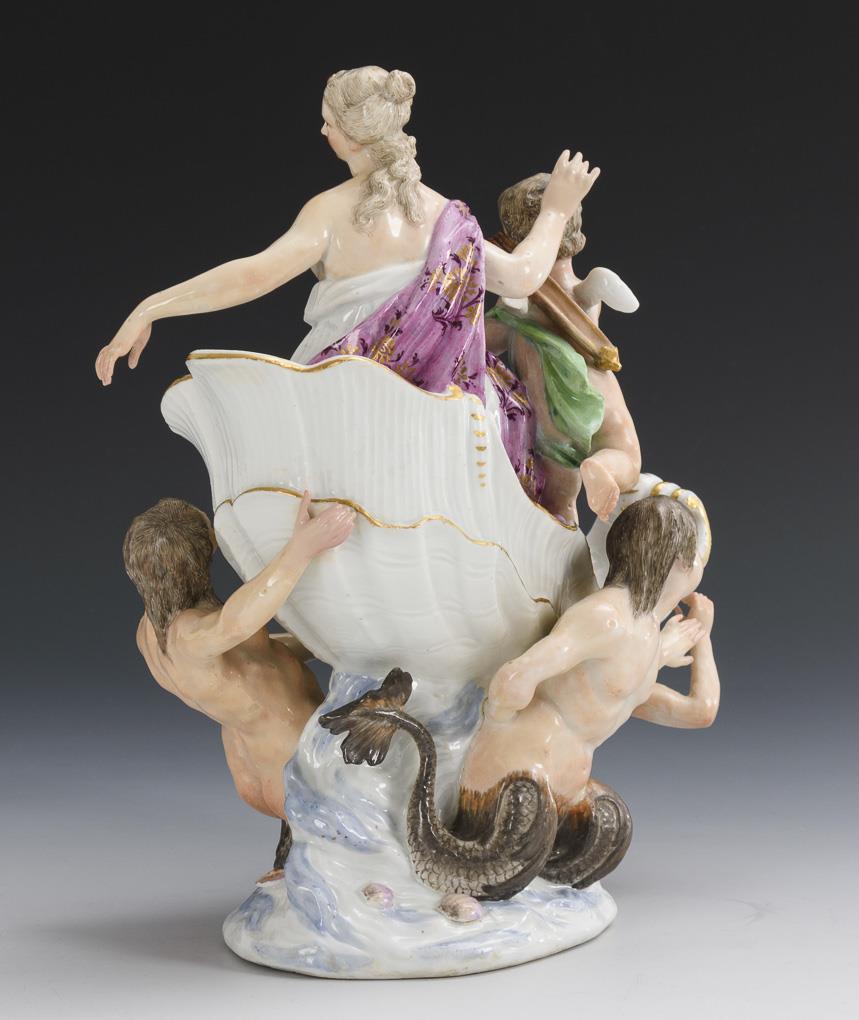Shell supported by three Nereids, in it Venus sitting with Cupid. Original part of a centerpiece with waterfall post. Restoration to 1 Nereid fin, hand and hip, both hands of Venus, 1 hand with arrow and 1 wing of Cupid restored, small glaze defects due to manufacture.