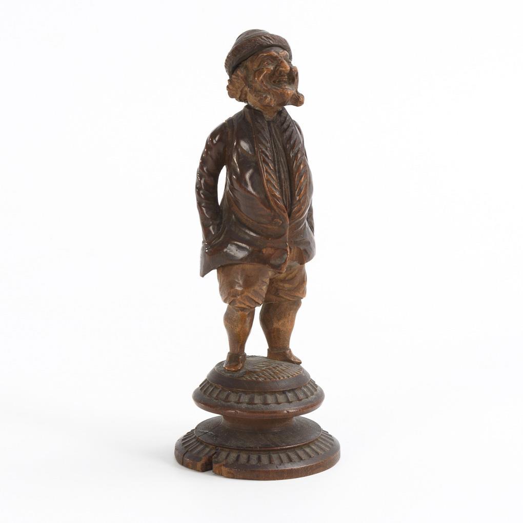 Wood carved in several parts, partly turned, stained in 2 colors. Probably 18th c. Under the base indistinct writing (du nort?). H 15,5 cm.