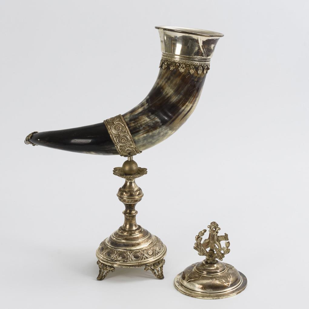 In the style of Baroque relief foot and mounts on the horn with a lyre as a lid crown. Under the lip engraved dedication to the 100th anniversary of the choral society Germania of Groß-Buseck 1913. Overcast heavily plastered, small hairline crack on the horn, some signs of age / use.