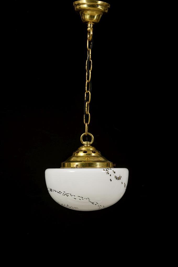 Brass, colorless glass with white inner catch. L approx 64 cm, Ø approx 23 cm.