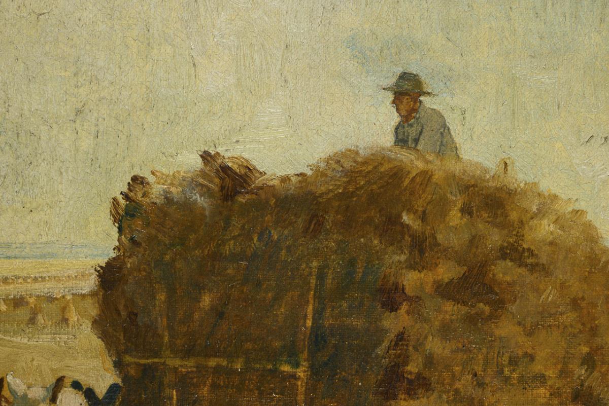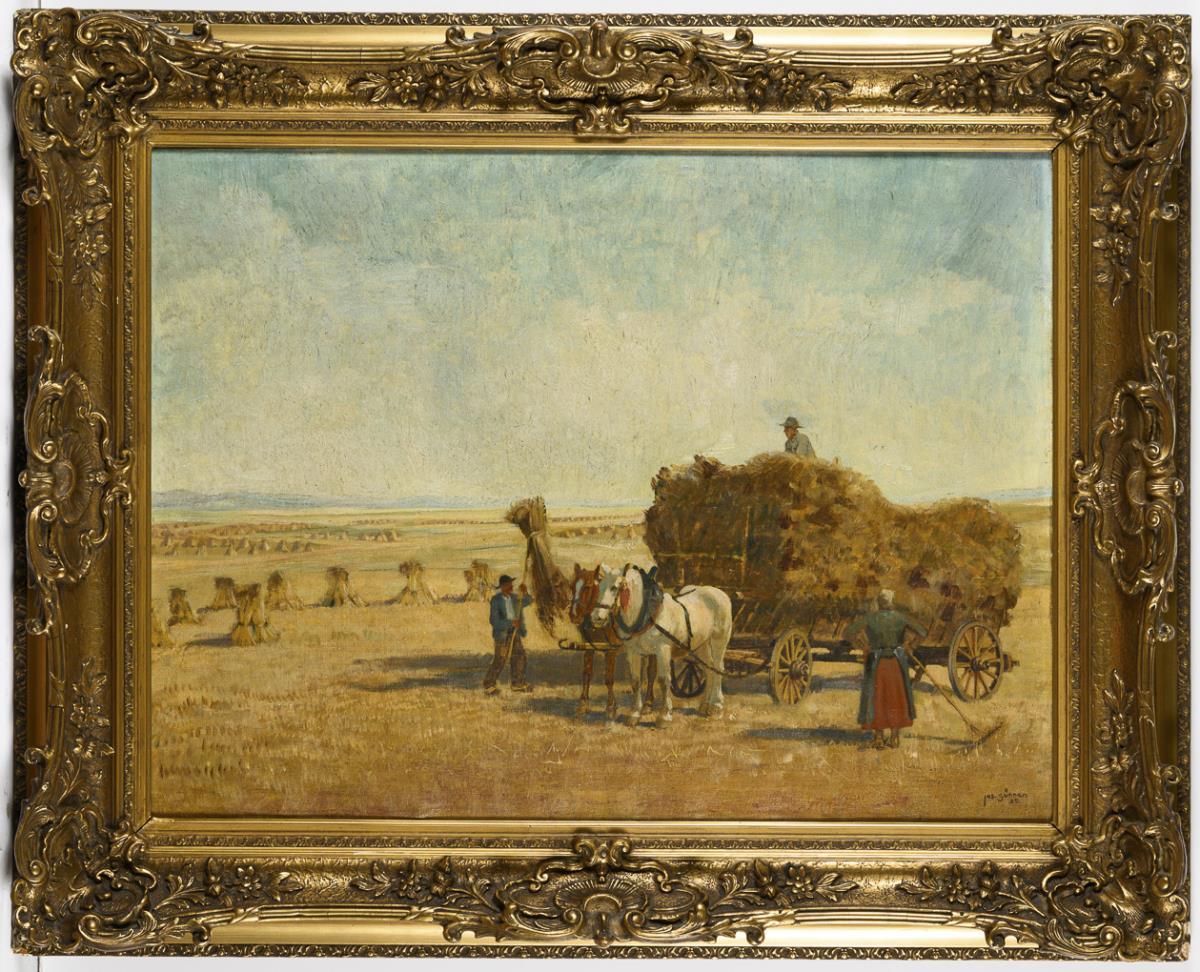 The farmers with the big hay cart loading the hay sheaves on the wide field.