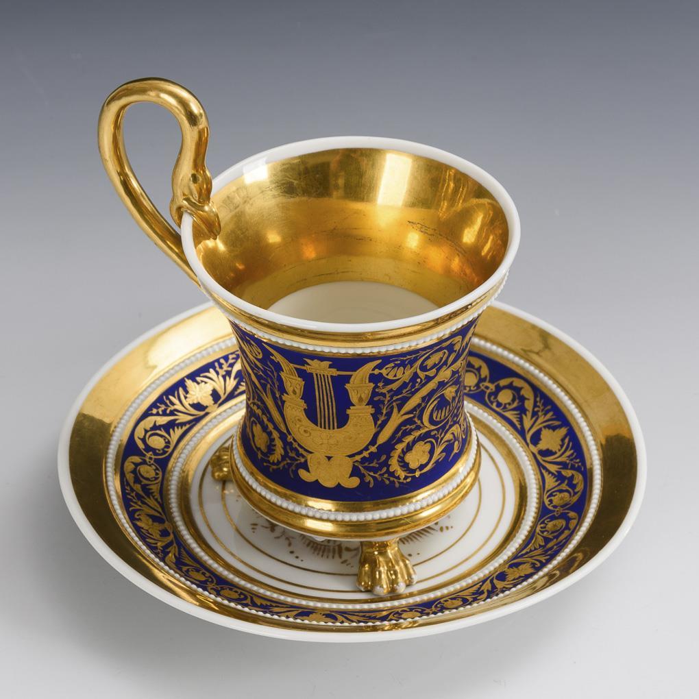 Craters cup with three paw feet, pearl bands and swan handle. Matte blue background with gold-etched ornamental pattern, richly decorated with gold. Minimal gold abrasion in the saucer mirror and on the paw feet.
