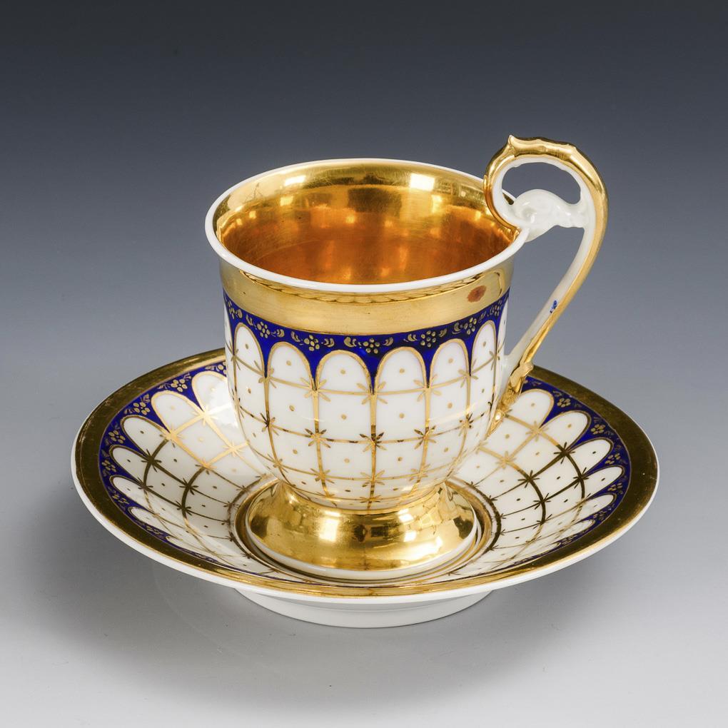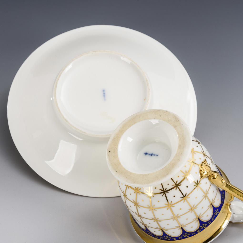Gold and blue decorated. Cup (h 11 cm), saucer (15 cm).