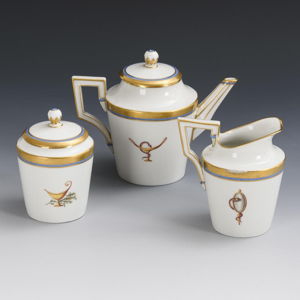 Polychrome painted, gold decorated. Jug (h 12,5 cm), milk jug (h 10,5 cm) and sugar bowl (h 10 cm).