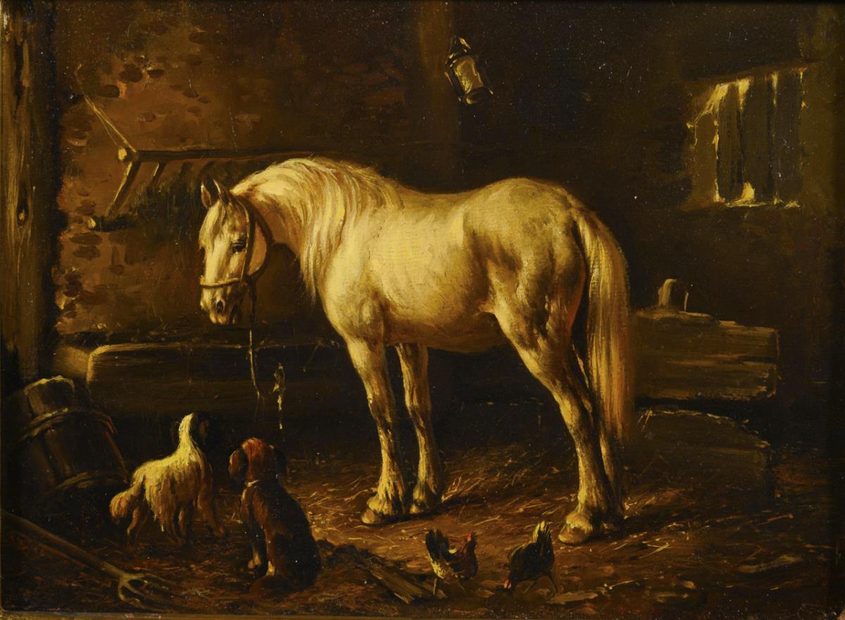 Unsigned: Horse with dogs in stable