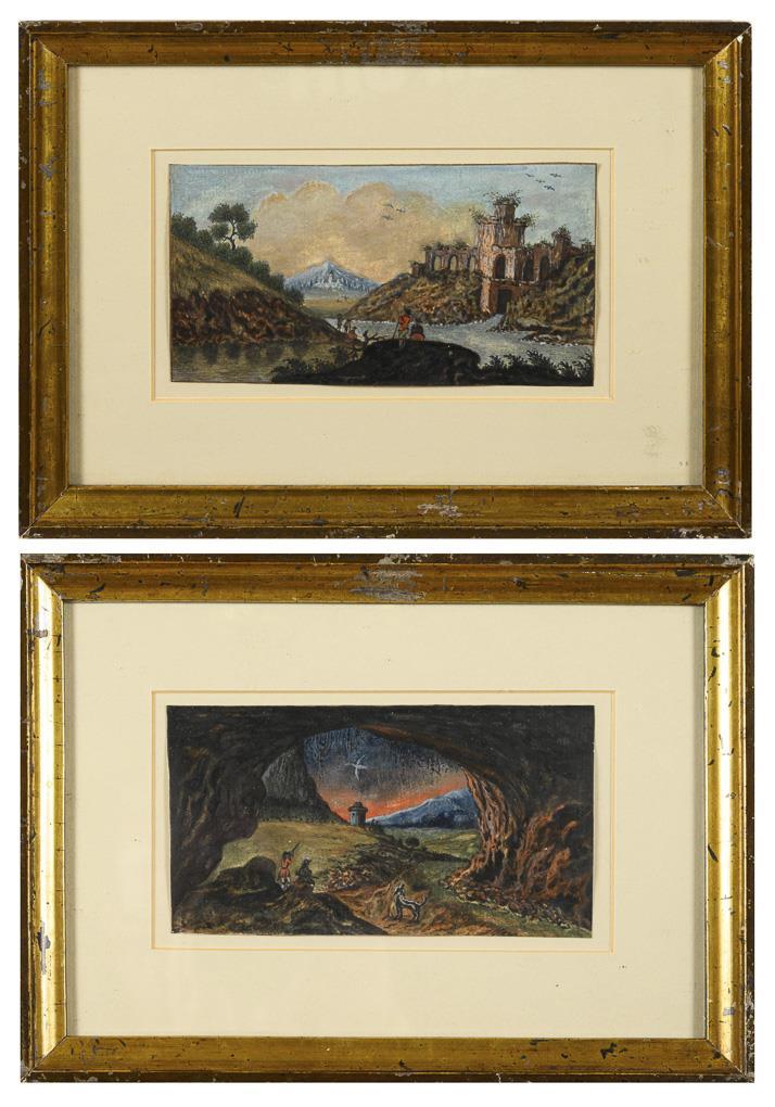 Staffage figures at a river with a view to a ruin under cloudy sky. Staffagefigures at the edge of a cave with view to a tower under dark sky.