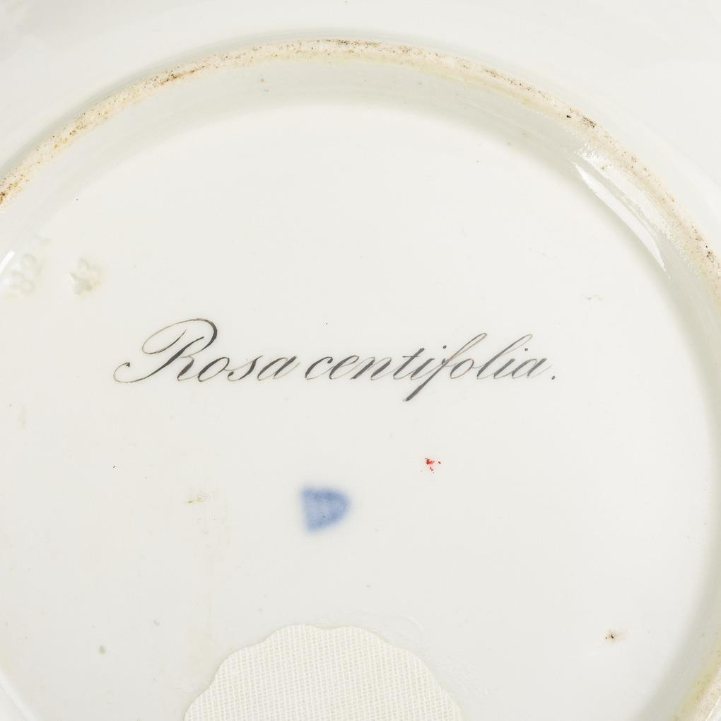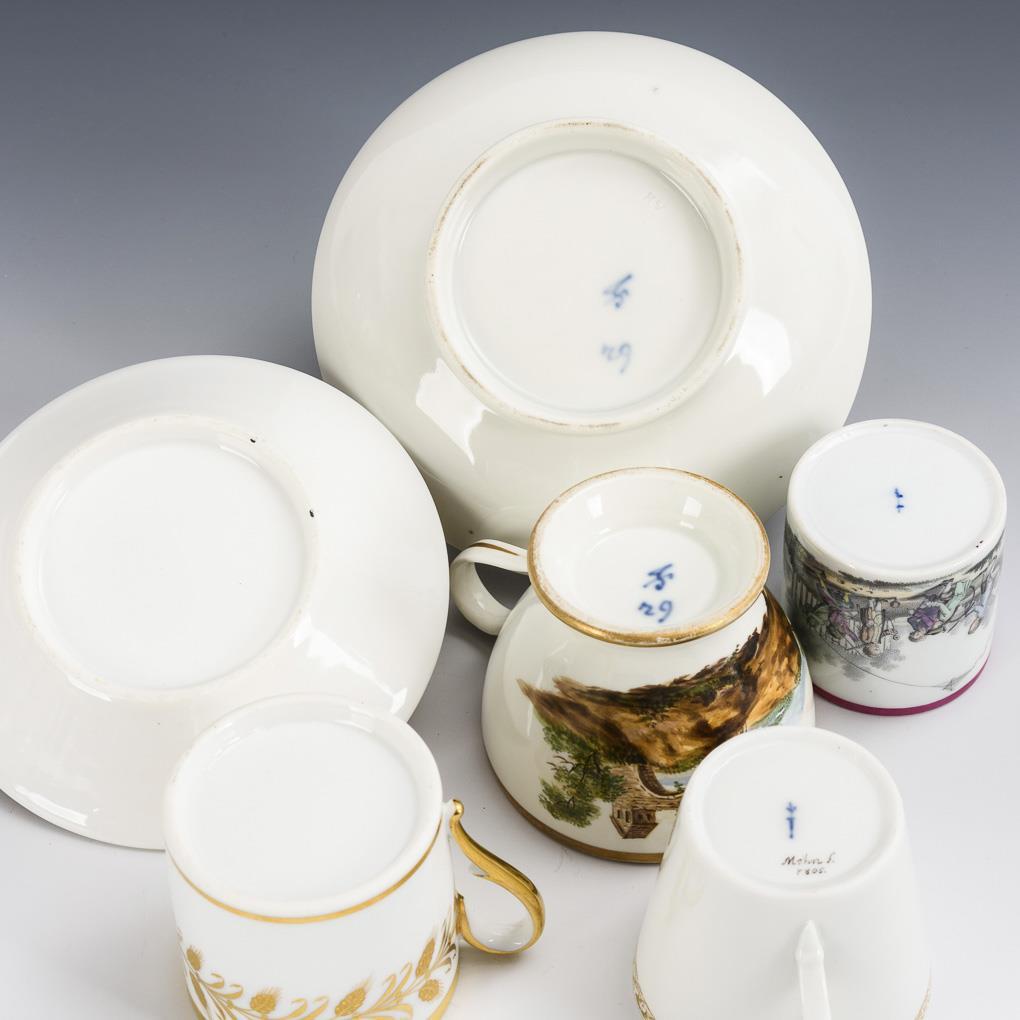 2x KPM Berlin, c. 1800: Rare cylindrical cup with the on-screen depiction of a group of children playing with kites, spinning tops and hoops (h 5.3 cm). Conical cup with the silhouette of a lady on the front, signed and dated on the bottom "Mohn f. 1805" (= Samuel Mohn) (h 6 cm). / 1x Fürstenberg, around 1820/30: footed, bulbous cup (h 6,5 cm) with landscape painting and original saucer (Ø 14 cm). / 1x unmarked, France, 1st half of 19th c.: cylindrical cup (h 6 cm) with gold engraved tendril of ears of corn and the date "ES. Paris le 1er octobre 1815.", with original saucer (Ø12,5 cm). / 1x Plate Vienna, year stamped 1823: beige flag background, in the mirror polychrome rose painting before brown background (Ø 24.5 cm). Partially minimal gold abrasion.