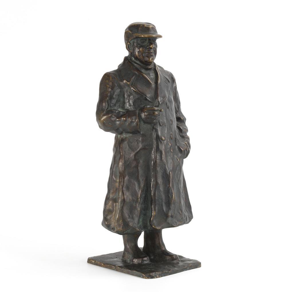 Very heavy fully plastic standing figure of a gentleman in a coat with a cigarette in his hand. Patina somewhat rubbed.