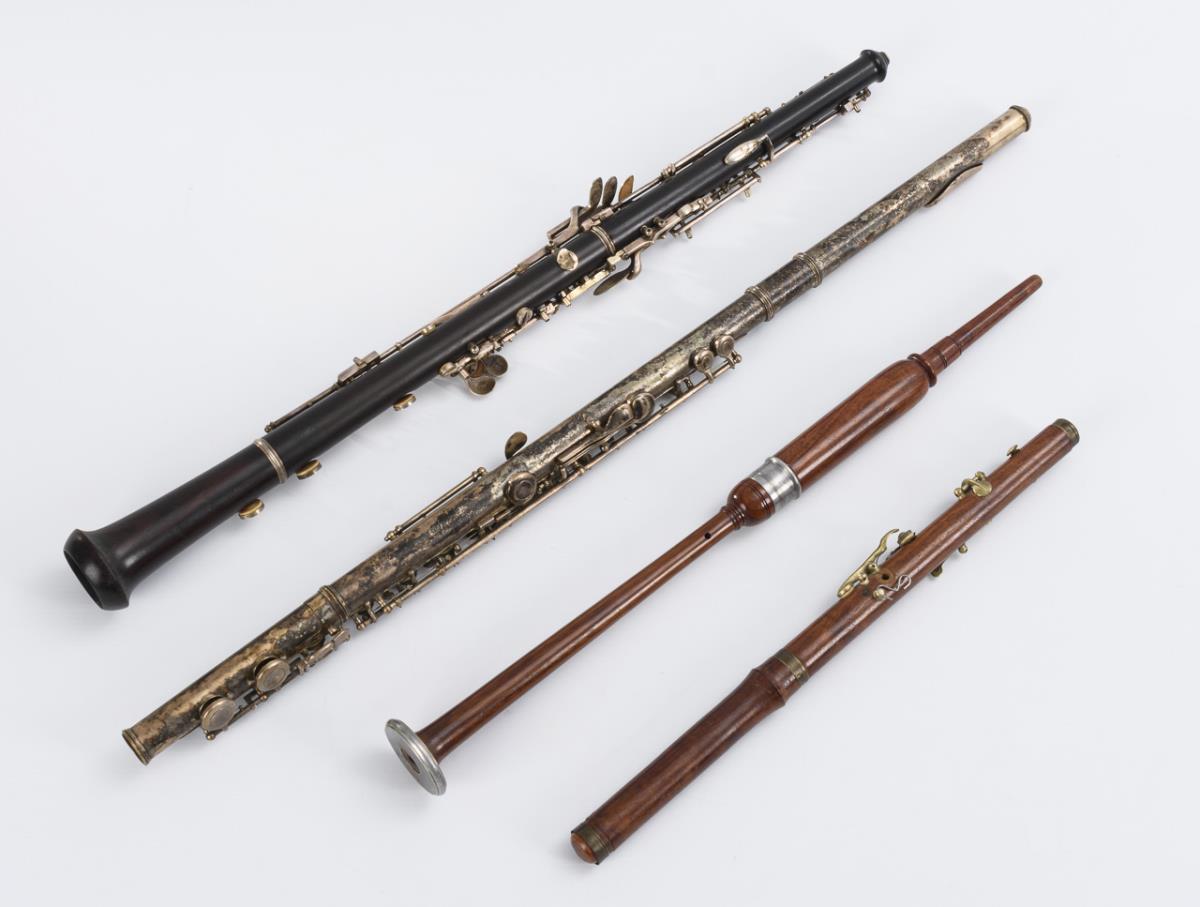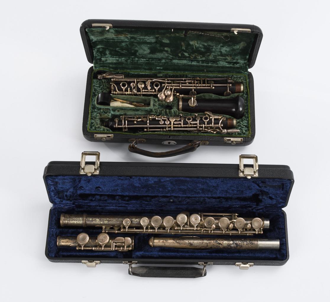 Unmarked silver-plated transverse flute in box. / "Ammon Kaltofen Wernitzgrün/Sa" marked oboe in box. / Defective piccolo. / Intact bagpipe. Traces of age / use, 1x defective.