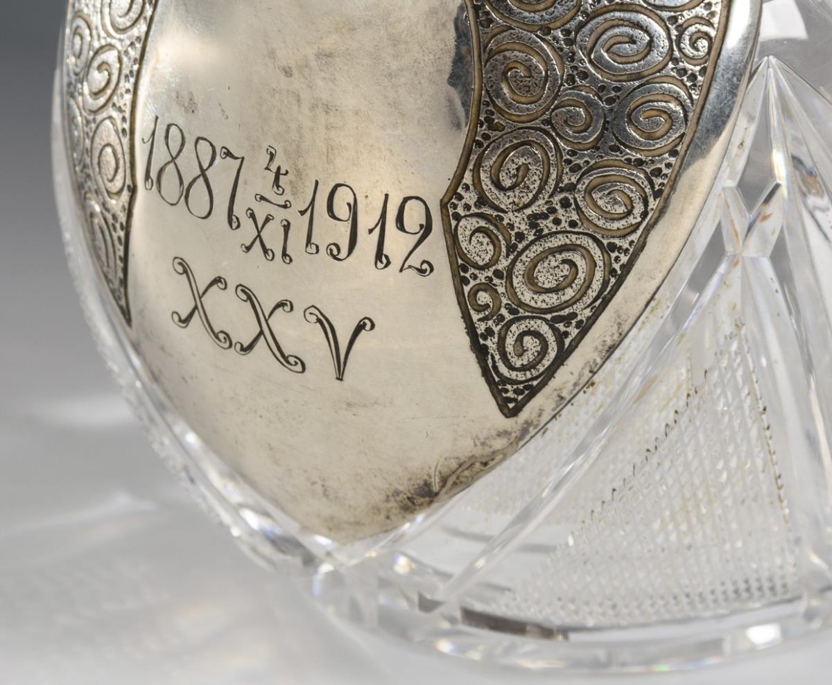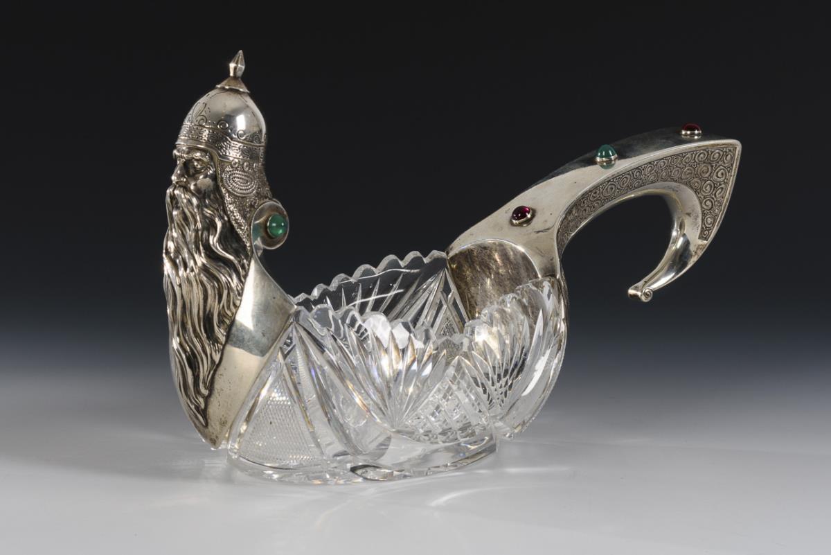 Richly cut glass bowl with bärtigem Viking head and decorated handle of silver with 5 colored stones. Under the handle engraved date: "1887 4./XI. 1912 - XXV", at the end of the handle intertwined monogram. Tiny edge bumps on the glass.