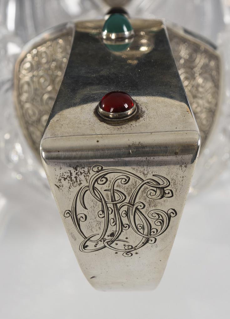 Crystal glass, silver, colored stone cabochons (probably garnet and green agate). 19.5 x 33.5 x 13.5 cm.