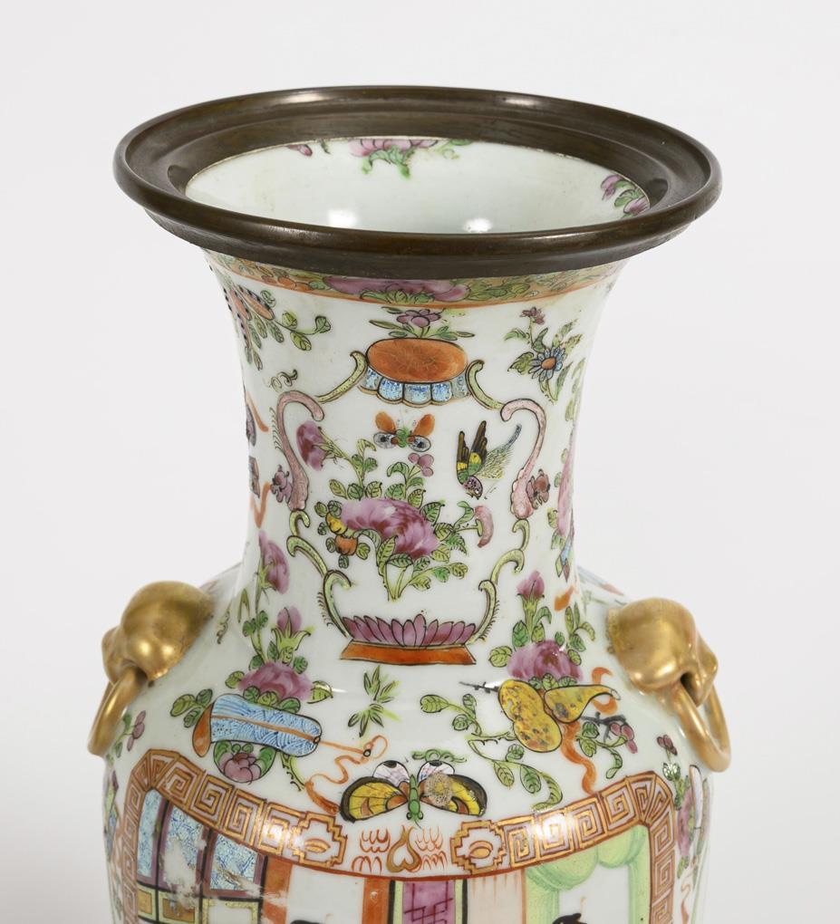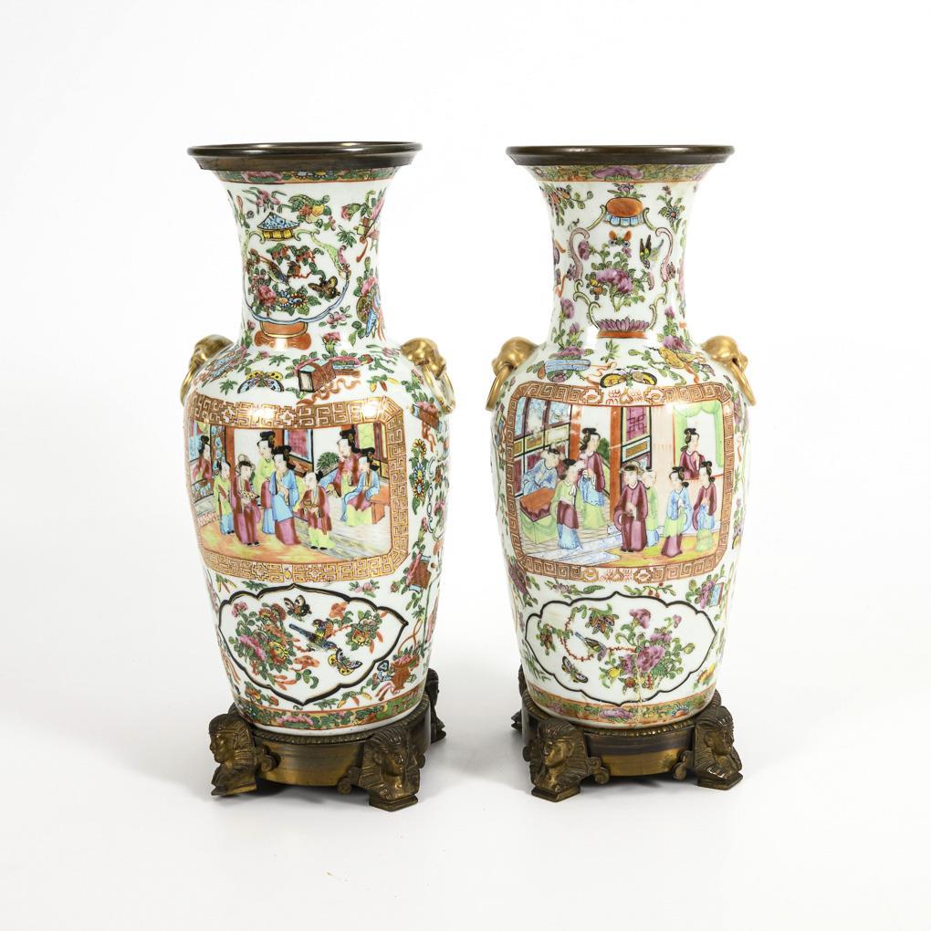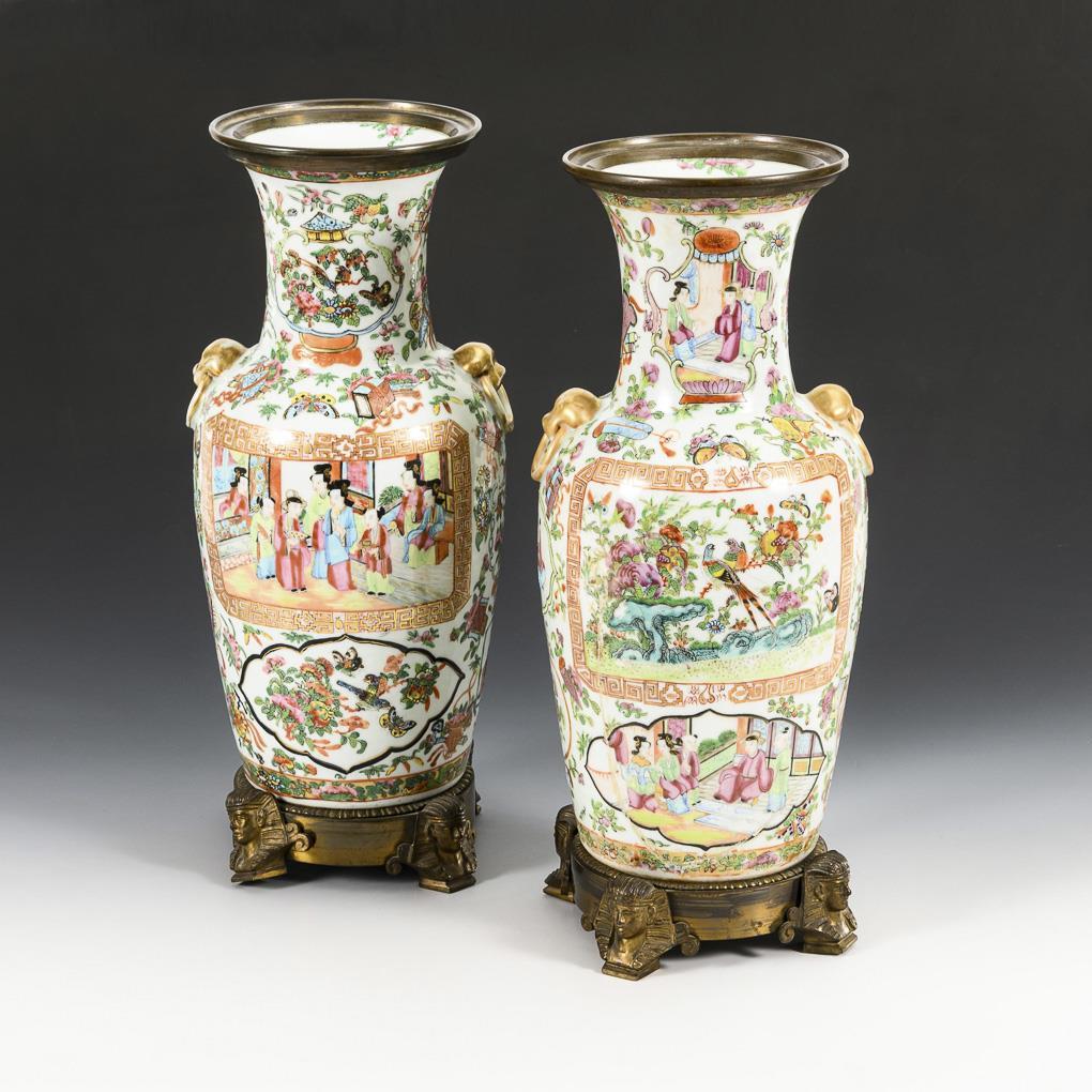 Baluster vases with fine polychrome enamel painting. Various cartouches with figural and floral depictions as well as bird and butterfly depictions. Vases very similar in decoration and painting, but not identical. Upper rim with simple bronze border, feet with Egyptianizing foot rings. One vase with traces of glue.