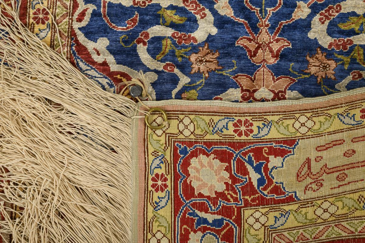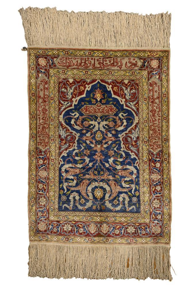 Niche carpet with curved, cherry-red mihrab, midnight-blue ground filled with cloudbinds and floral decoration in curvilinear style. Multi-row borders with floral vines and Shah Abbas palmettes, long twisted fringes, some looped. Mihrab and border with gold-brocaded cartouches and Arabic characters. Verso with Ösenaufhängung.