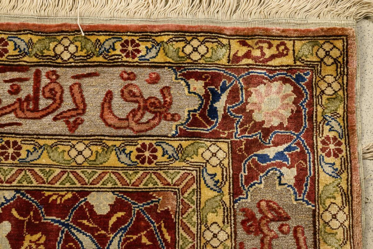 Silk on silk, gold brocade. Extremely fine hand knotting with about 1 million knots per sqm. Polychrome decoration. Approx. 76 x 55 cm.