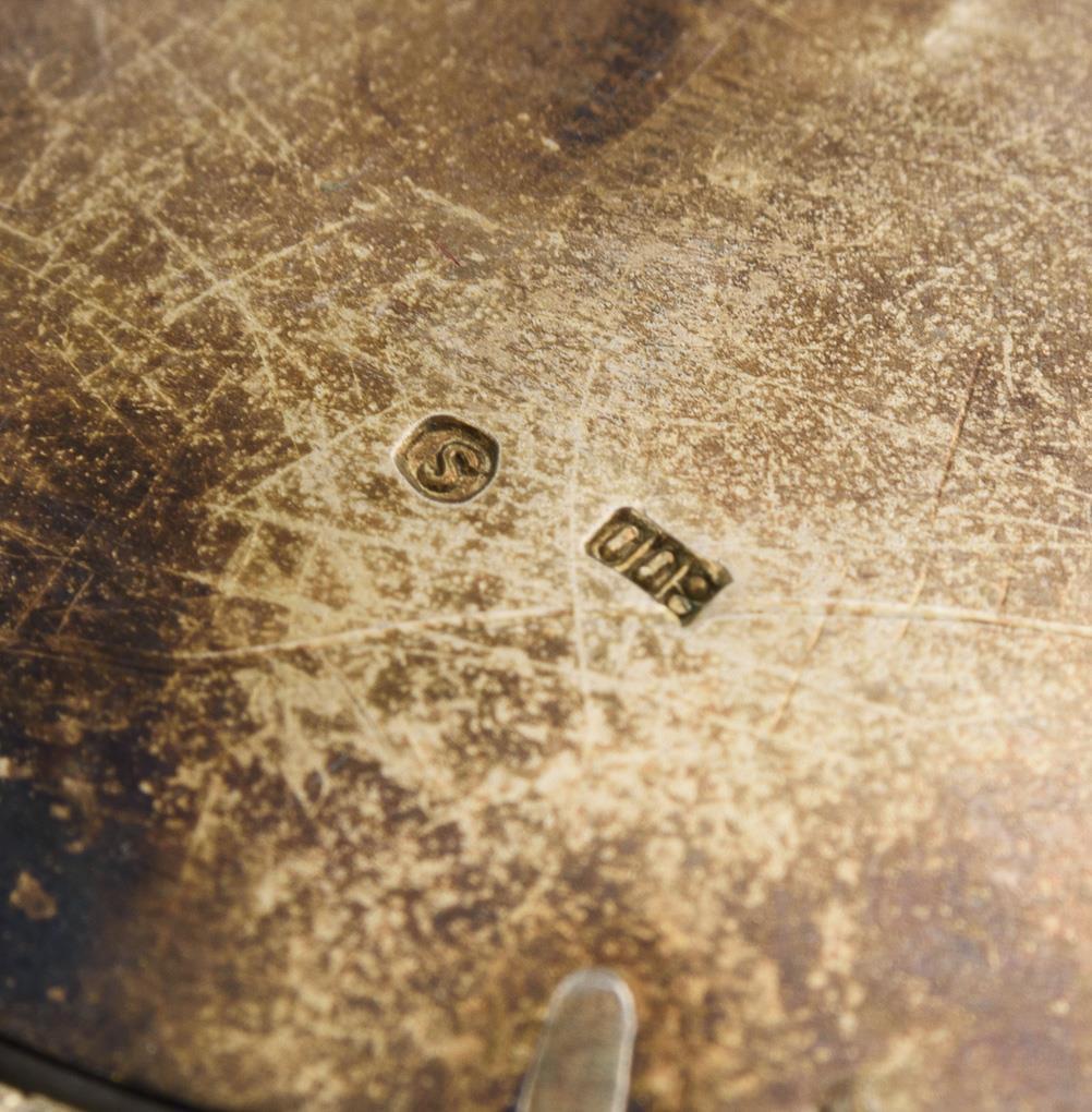 Enamel painting probably on milk glass or porcelain, silver. 6,5 x 5 cm. 24 g.
