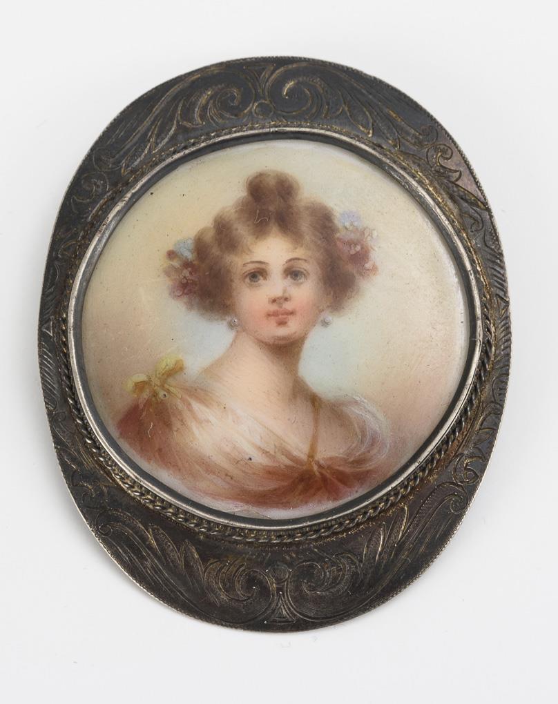 Painted tondo of a pretty woman with flowers in her hair. Oval, slightly domed silver plate with ornamental engraving.