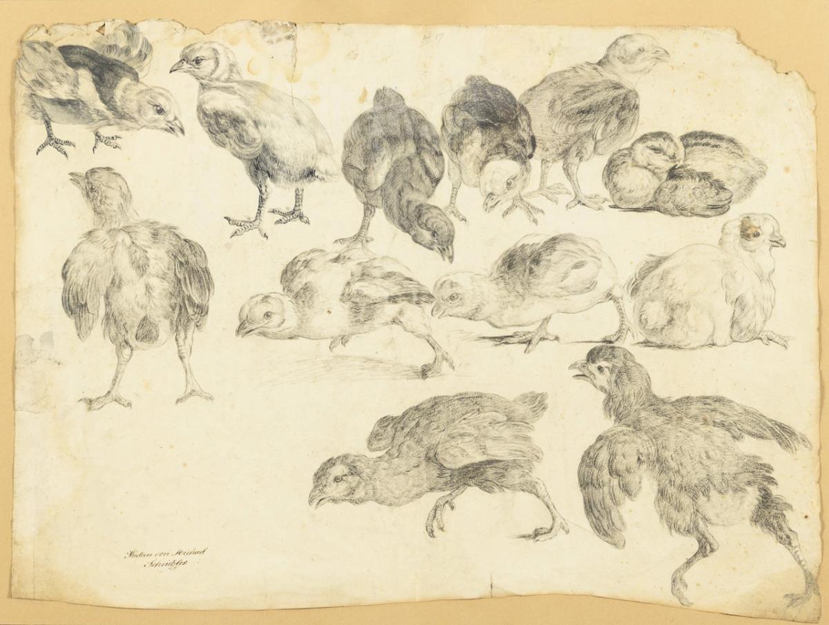 Motion study of young birds, inscribed in sepia ink "Studies by Michael Schnitzler". Sheet with small tears, creased, somewhat stained and foxed.