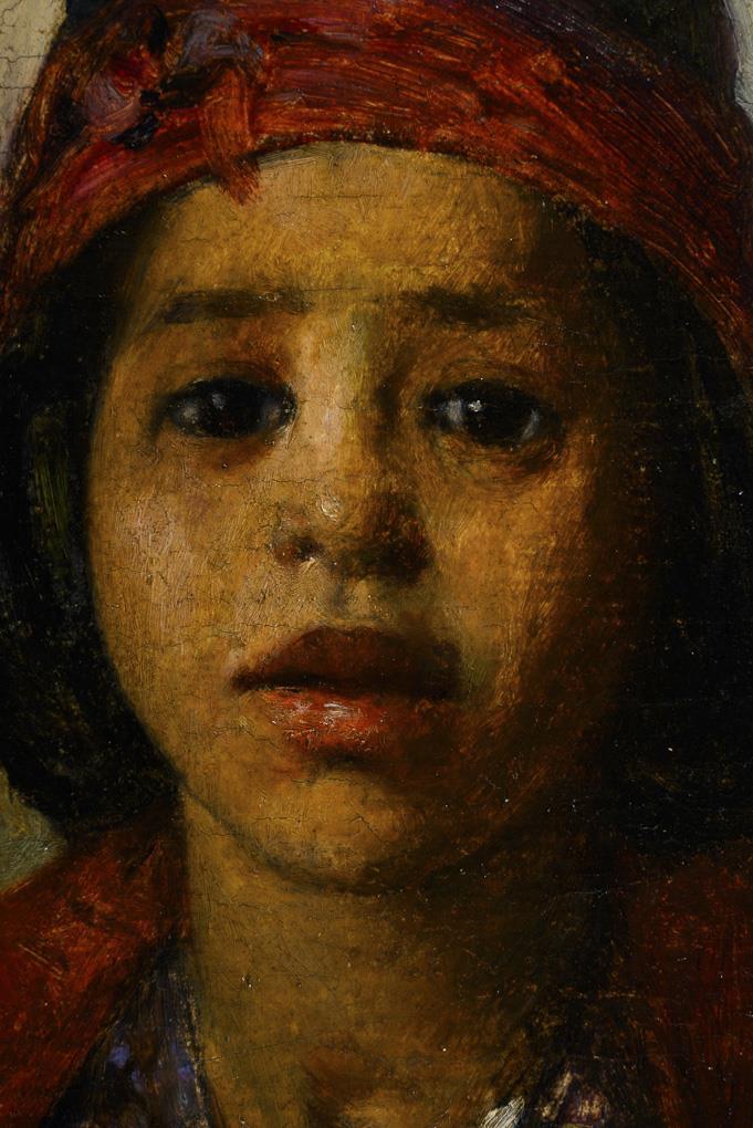 Portrait of a child with headdress and long hair. Traces of age.