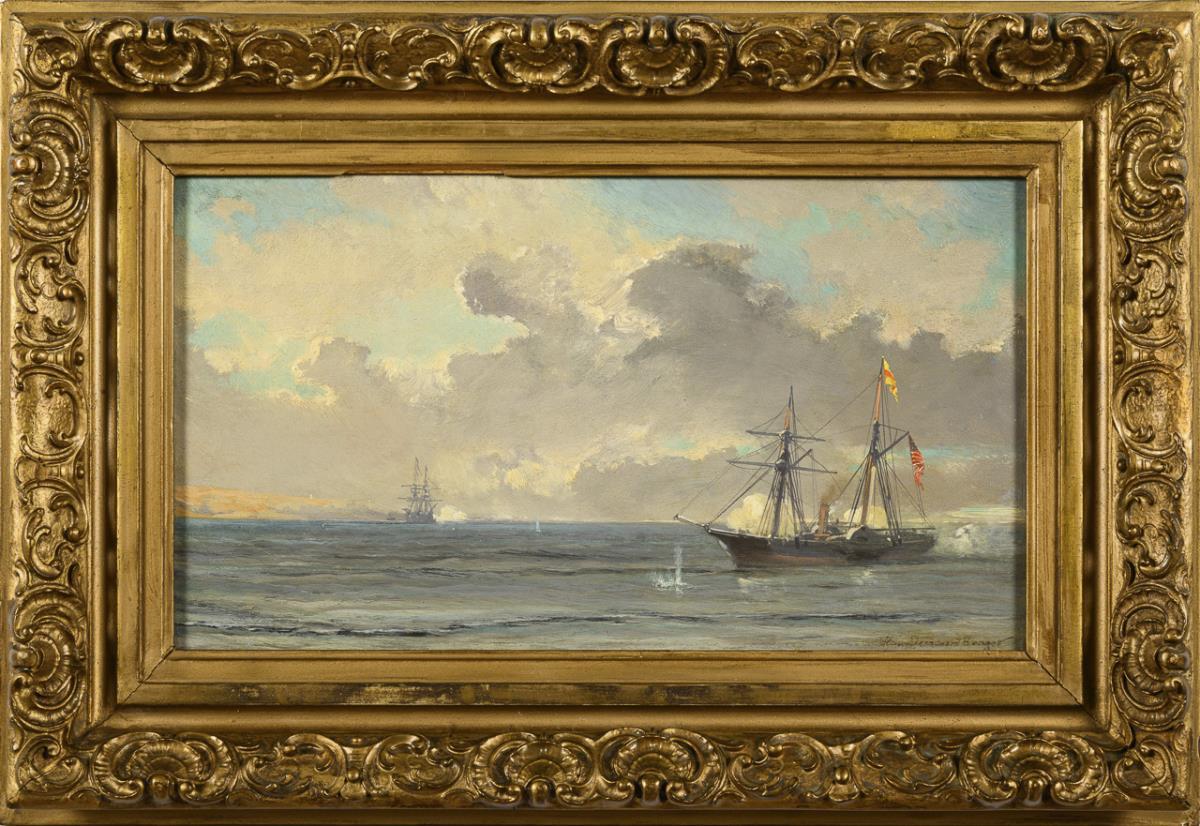 Near a two-master with American flag striking ammunition from a warship on the horizon.