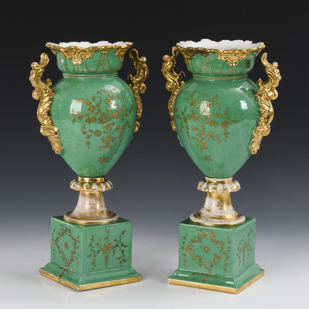 Amphora vases with two rocaille handles, multi-pass rim and round base, on square base. Green background with rich gold relief painting as well as a cartouche on the front with a bouquet of flowers. Gold partially rubbed, 1x mouth rim restored.