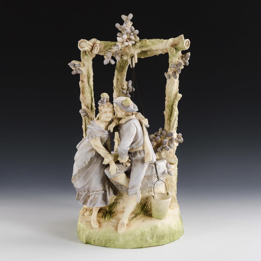 Large fountain with flowered branch construction and buckets on a pulley, at the edge of the fountain a young lovers standing. Some petals bumped.