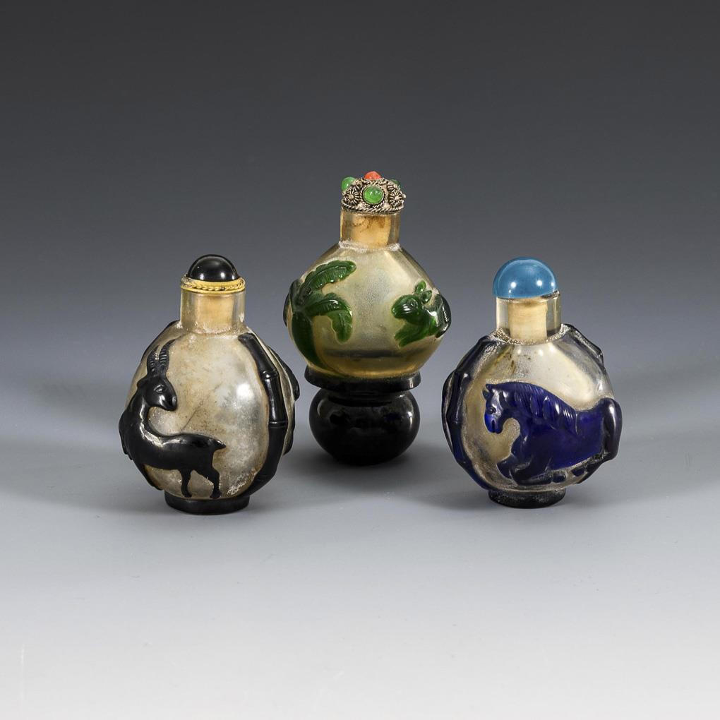 3 snuff bottles with animal illustrations.