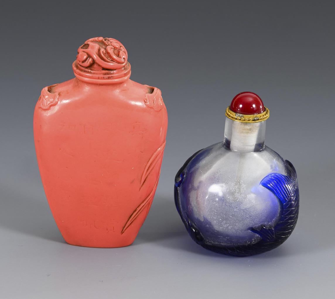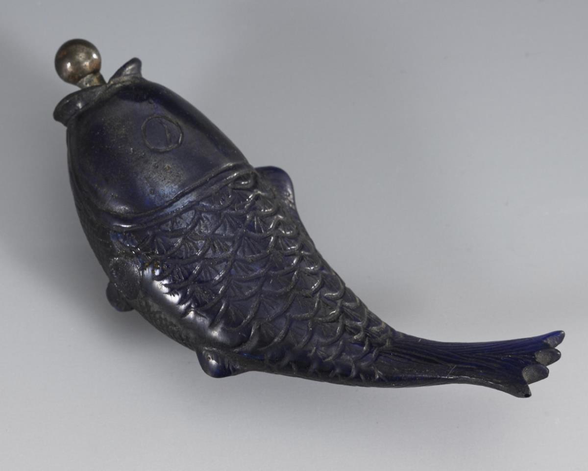 Blue glass fish. / Clear glass, spherical shape with large blue fish in overlay technique. / Pink bottle with fish in relief, characters and matching stopper.