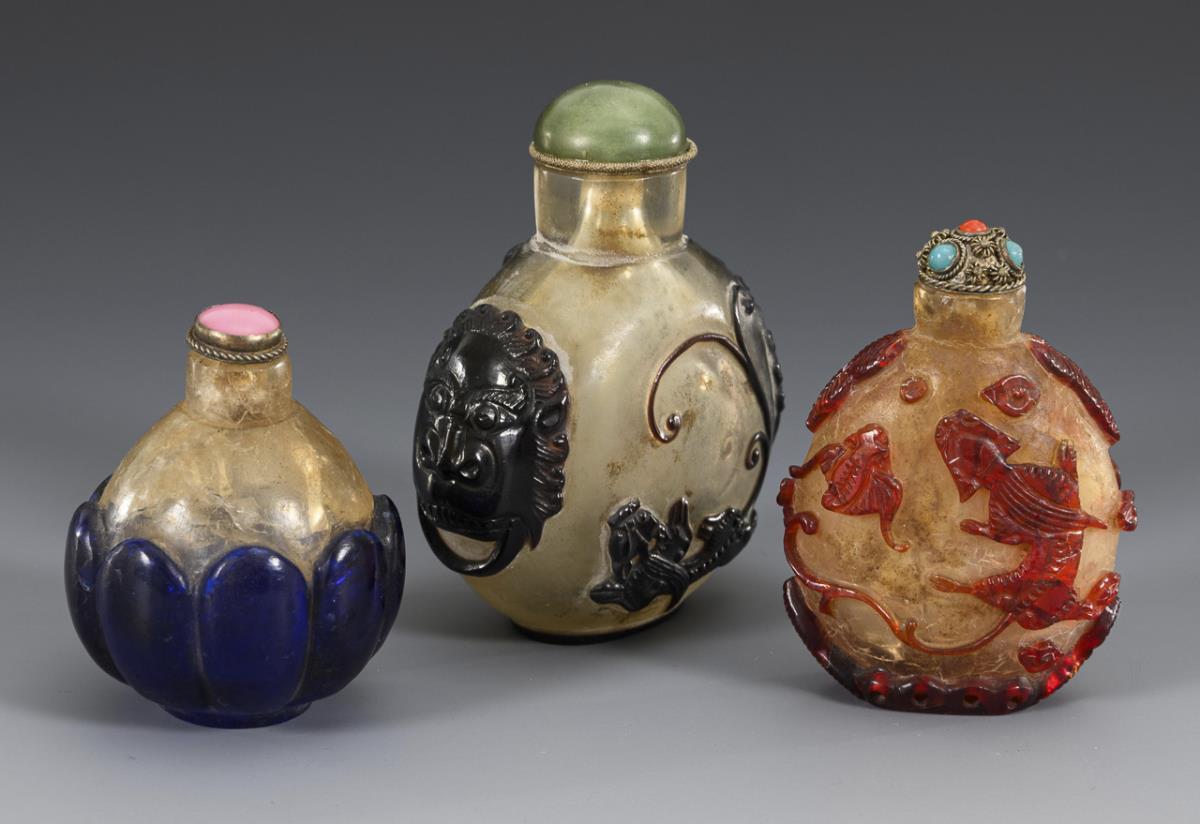 3 Snuffbottles with different colored over.