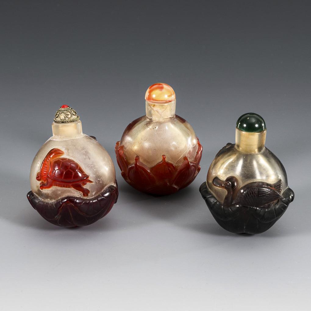 Sphere body with red to red-brown overlay. / Turtles over lotus leaf. / Fish and duck over lotus leaf and stylized leaf frieze as pattern edge. All three with stopper. one with stress cracks.