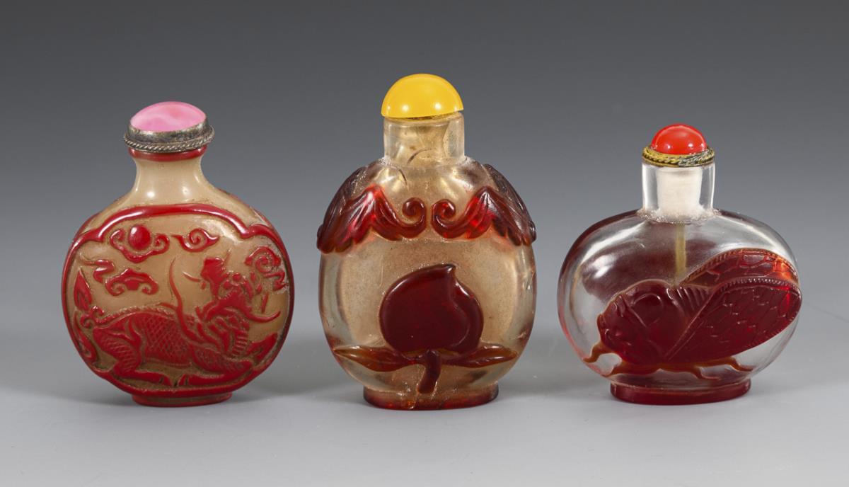 Clear glass with one grille per side. / Teardrop shape with peach and bat motif. / Frosted glass, with motif of a dragon and a horse. All with stopper.