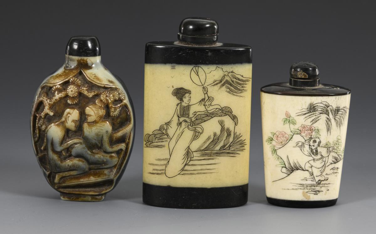 2 vials made of horn and bone, with engraved figural scenes. / A bottle in stone-look. with relief erotic scenes, made of plastic.