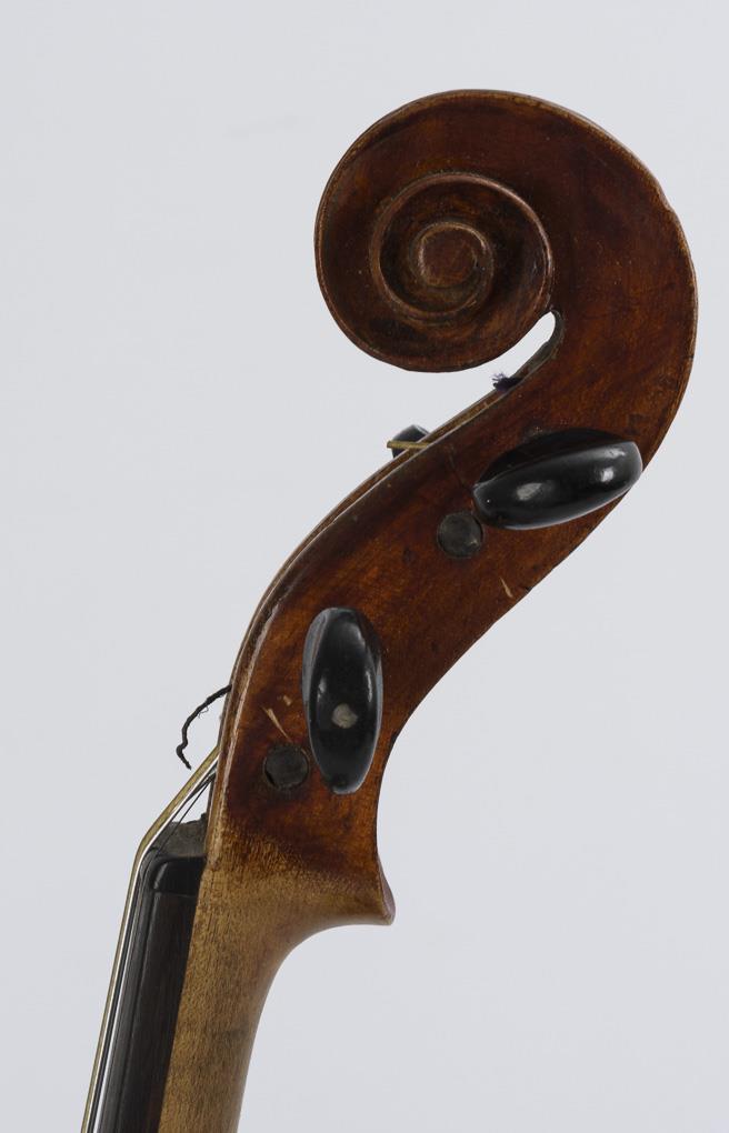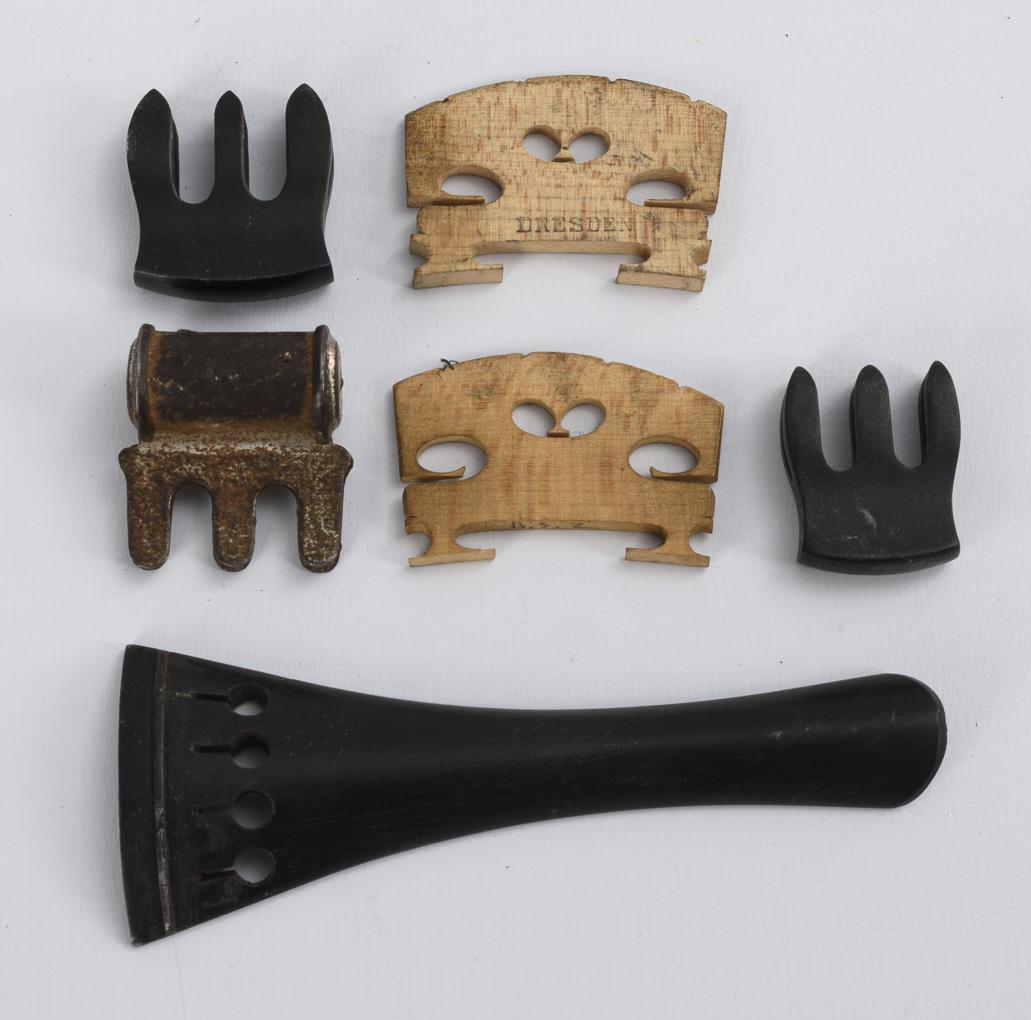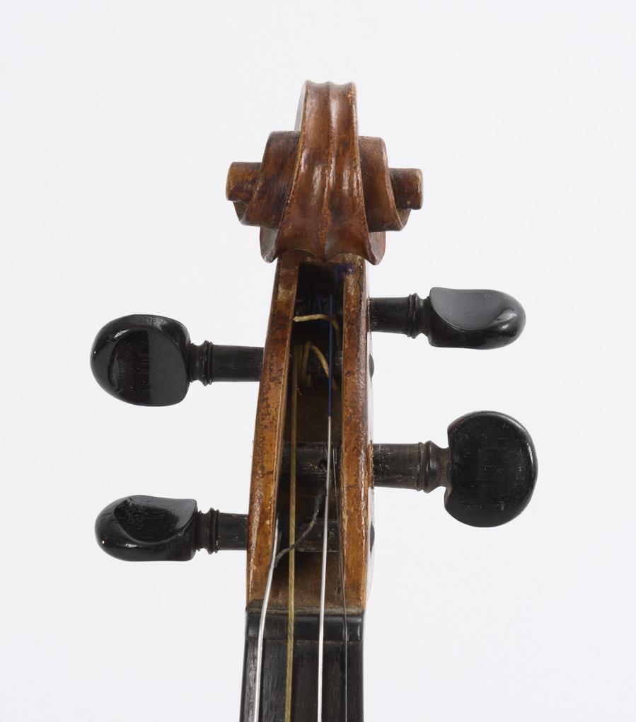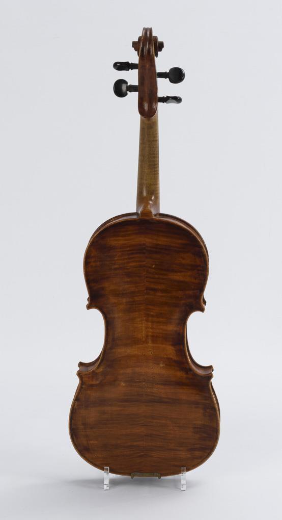 Violin with chin rest. Unmarked bows. Some accessories (3 mutes, of which the metal mute "Ton-Wolf" marked, 1 tailpiece, 2 bridges). Deep scratches v.a. on the top, 1 top edge outside the purflings added. 1 bow warped, thumb leather / wrapping missing or supplemented. Case heavier signs of age/use.