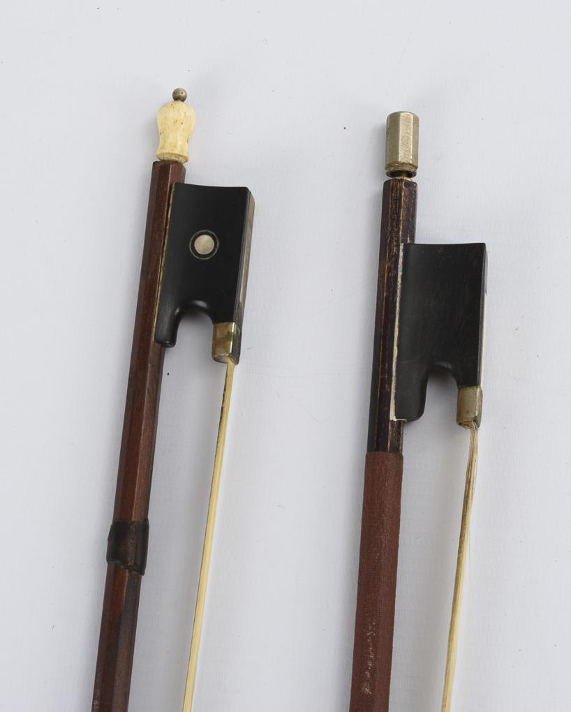 Locked maple, spruce top, ebonized wood. Bows brazilwood or lacquered wood. Body 35.5 cm, bows 71 and 71.5 cm respectively.