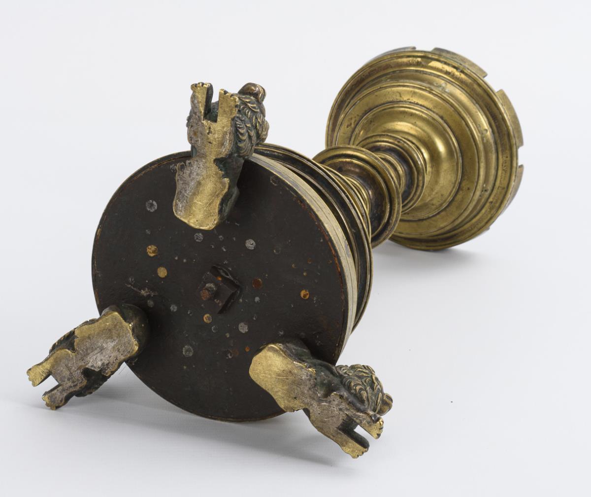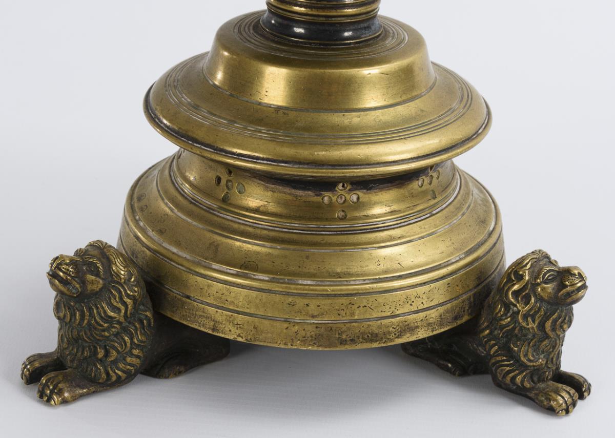 Candelabrum supported by 3 fully plastic lions with profiled round base, rod shaft with 3 disc nodi as well as wax plate with 8 cut out pinnacles and brass spike. Base closed with iron plate; continuous iron threaded rod. Few signs of age/use.