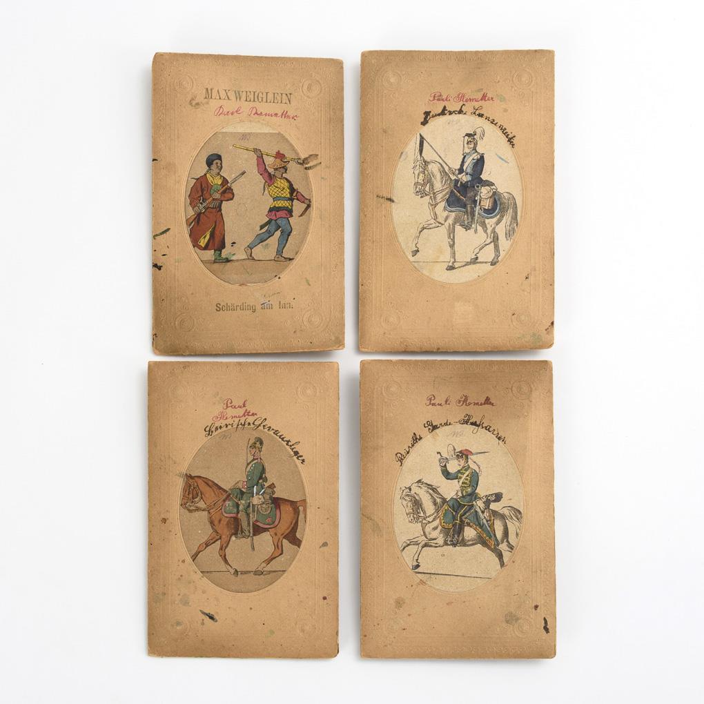 Similarly embossed cardboard covers with laminated colored lithographs of soldiers, 1x stamped "Max Weiglein, Schärding am Inn", each with handwritten owner's name and 3x titled: "German Lancers", "Prussian Guard Hussars", Bavarian Chevauleger", 1x Asian fighters. In the folding covers each soldiers (mostly horsemen) of embossed cardboard; partly colored and as shown on the cover. A total of about 42 pieces. Signs of age / wear, some missing parts on the soldiers.