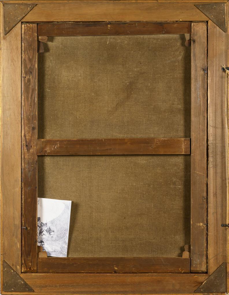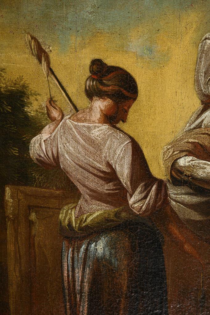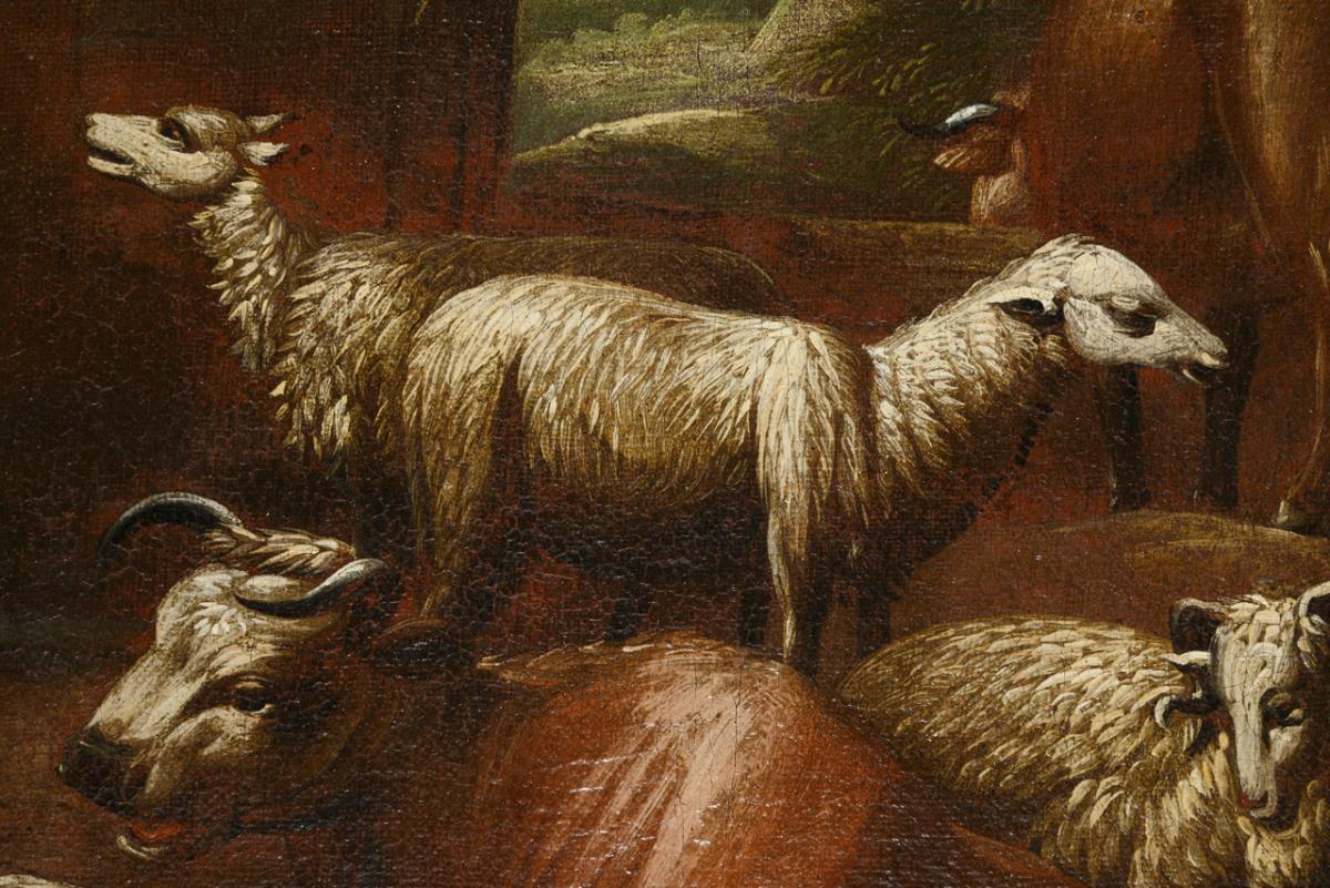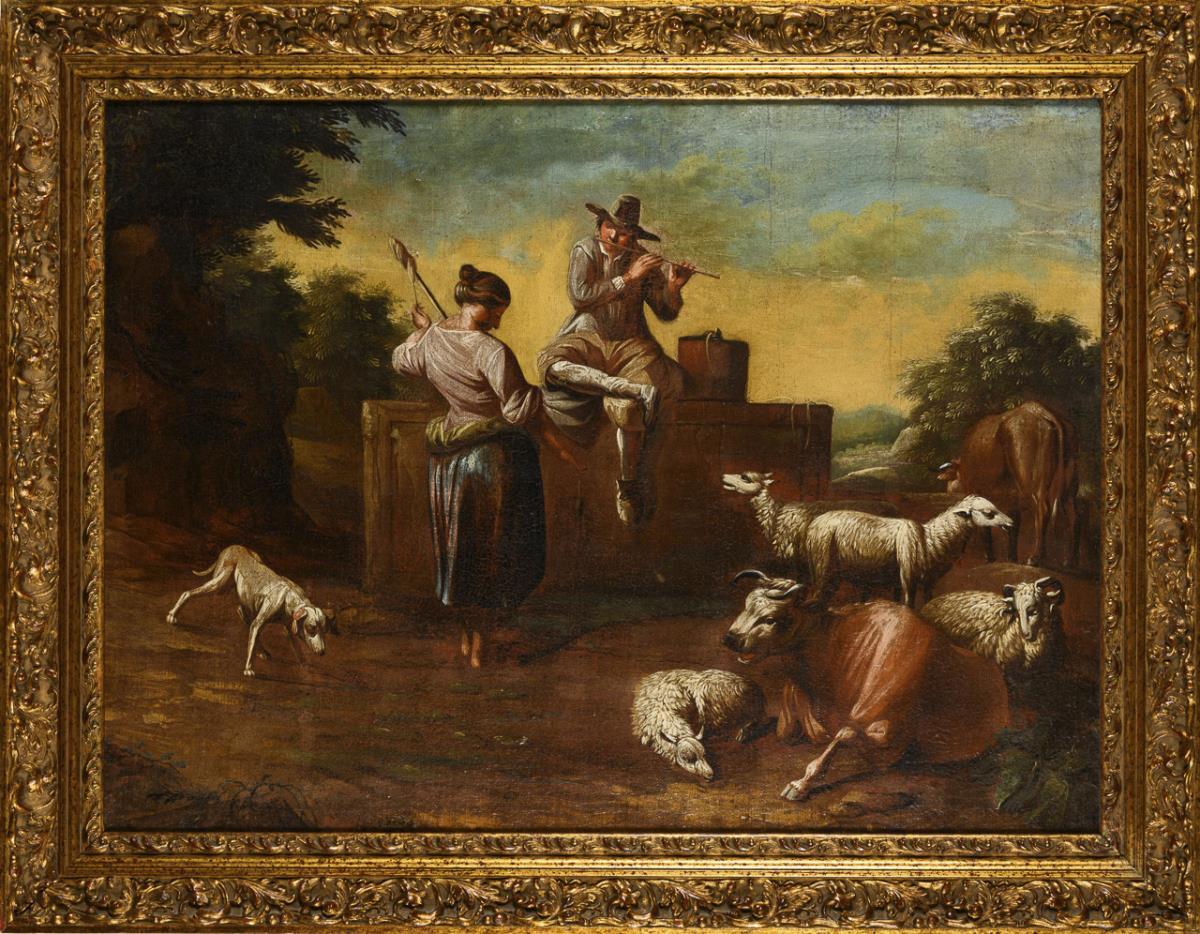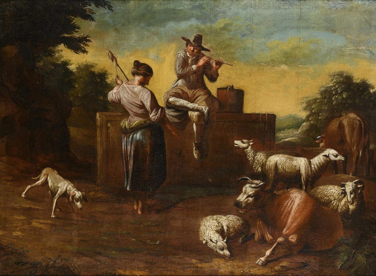 Shepherd playing a flute at a well with a young woman spinning yarn and the animals. Canvas doubled.