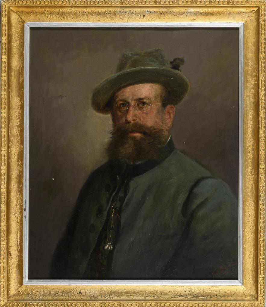 Portrait of a bearded man in hunting regalia against a neutral background. Retouched in the background.