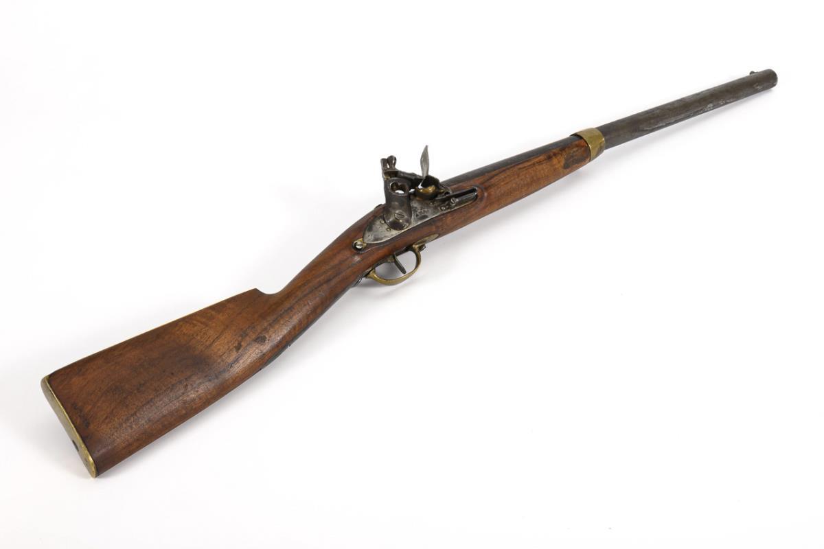 Smooth bore, large caliber barrel with rear sight. Flintlock marked "M re R de Mutzig". Rail with two rings. Butt also marked "Mutzig", butt plate numbered "2368". Mechanics works.