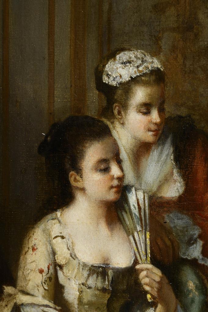Three women in stately robes with fächer and letter in conversation. Two restored places with rear adhesions.