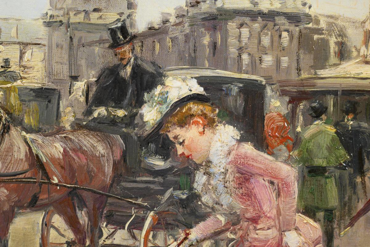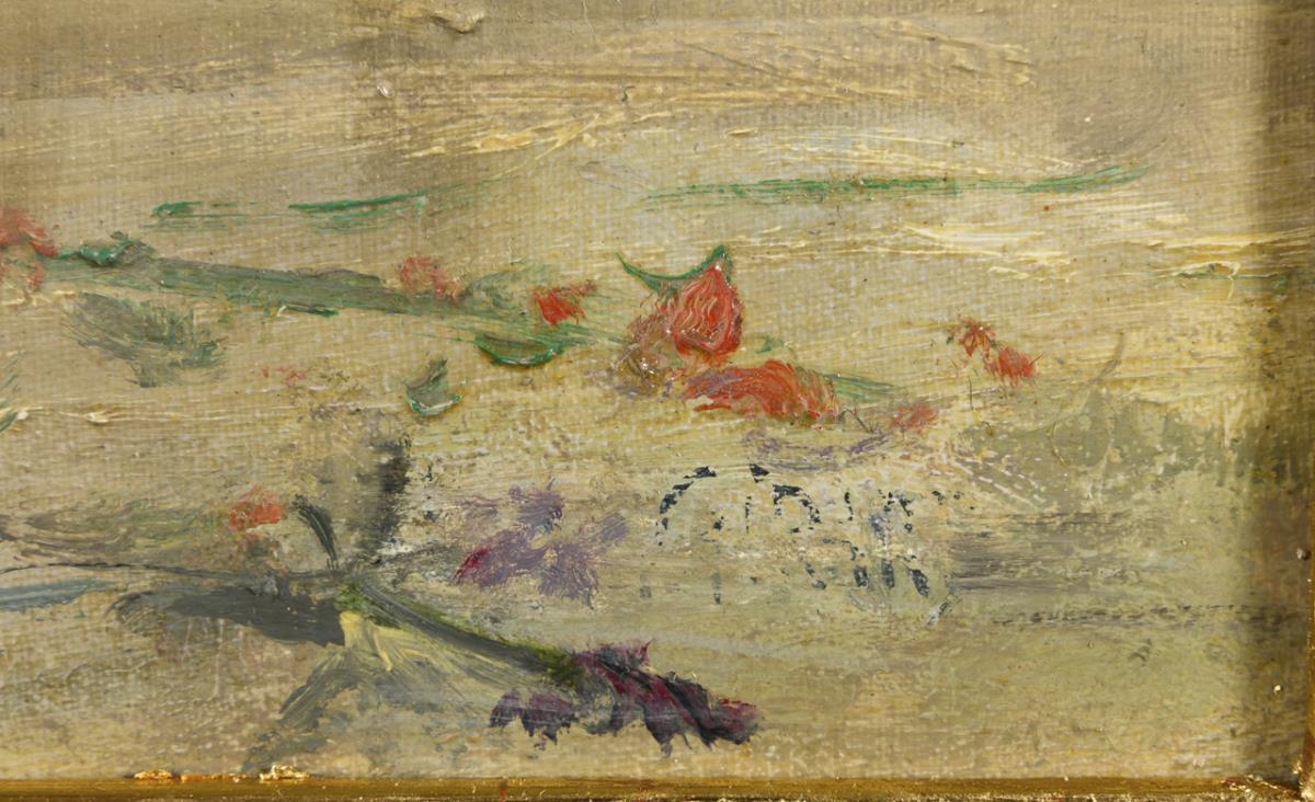 Oil/canvas/wood. Lower right residual signature, verso indistinct wax seal. Circa 1900.