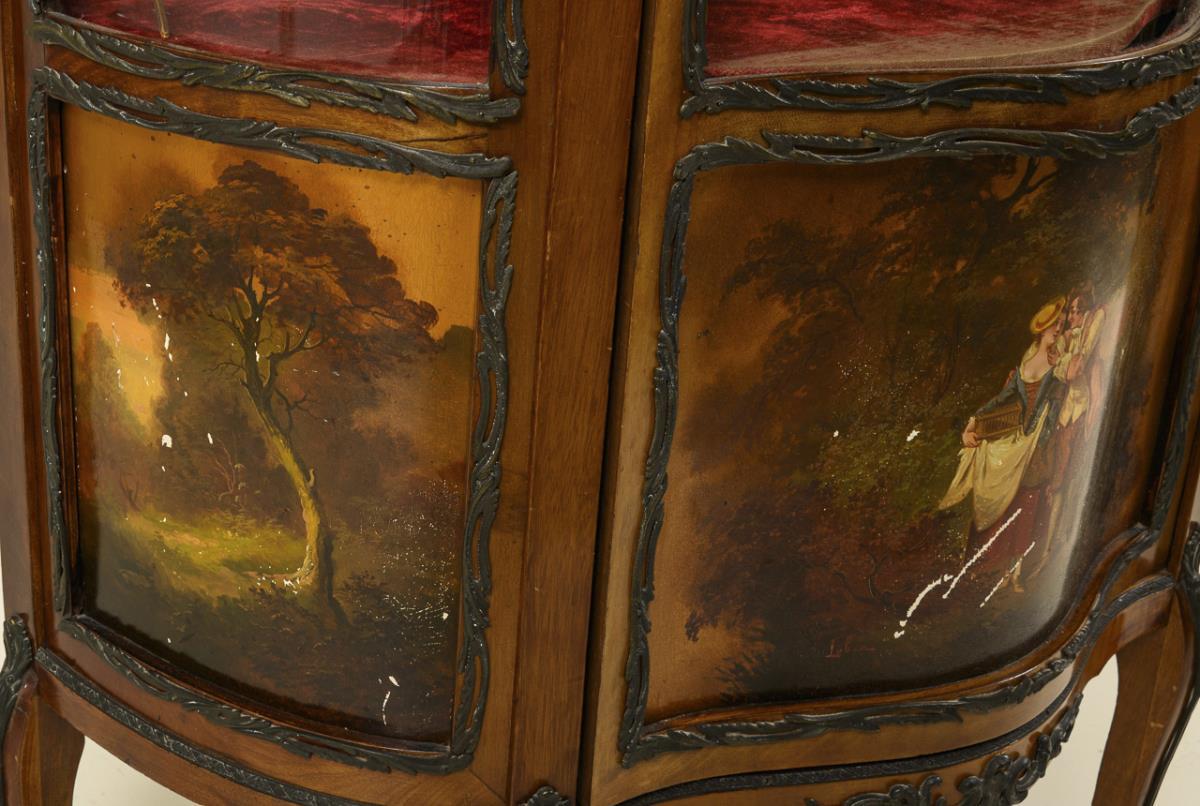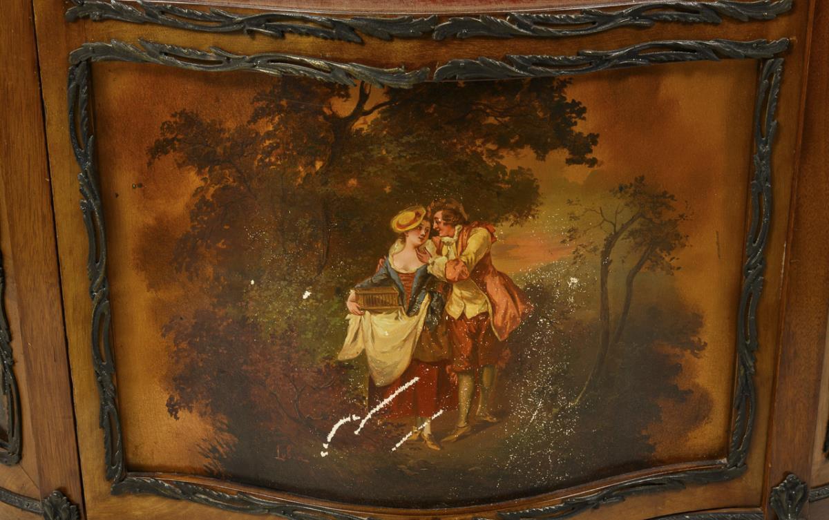 Elegant display cabinet with Watteau painting.