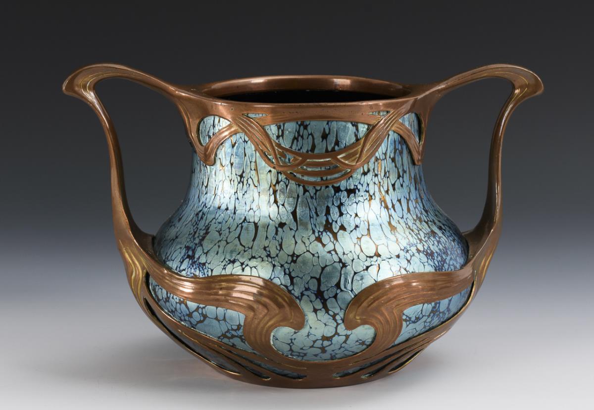 Art Nouveau vase "Ruby Papillon" with copper mounting. Lötz.