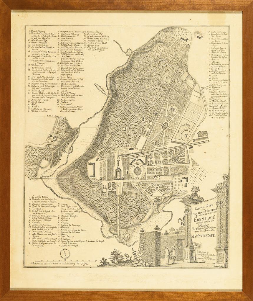 Ground plan of the famous landscape park in Bayreuth after the design of the architect Johann Gottlieb Riedel (1722 Schleiz - 1791 Bayreuth), with detailed legend in German and French, at the bottom margin poorly legible pencil dedication. Sheet light browned, some foxing, with rubbing.