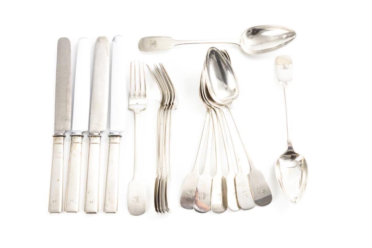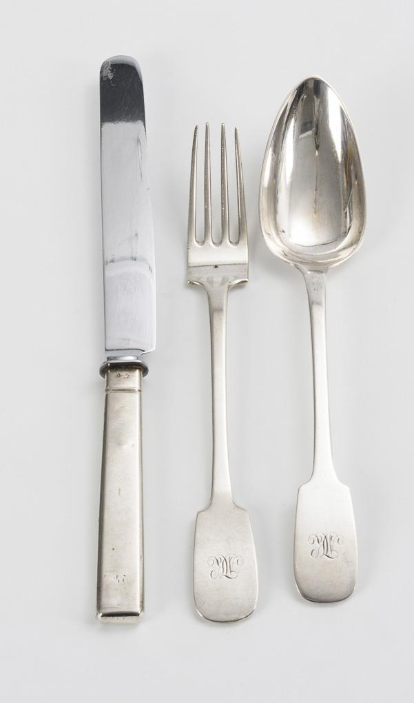 Smooth spade shape with intertwined monogram engraving: 6 dinner forks, 4 dinner knives and 8 soup spoons. Slight signs of use, knife handles somewhat dented.