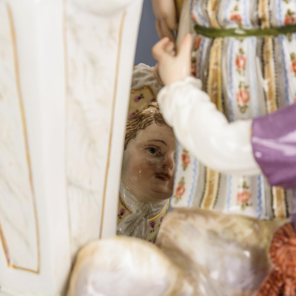 Group of three children on a natural base with apple tree and female torso, the girl walking on stilts. Restoration to leaves and branch ends, partial leaves bumped, torso restored, stele of the torso screwed underneath.
