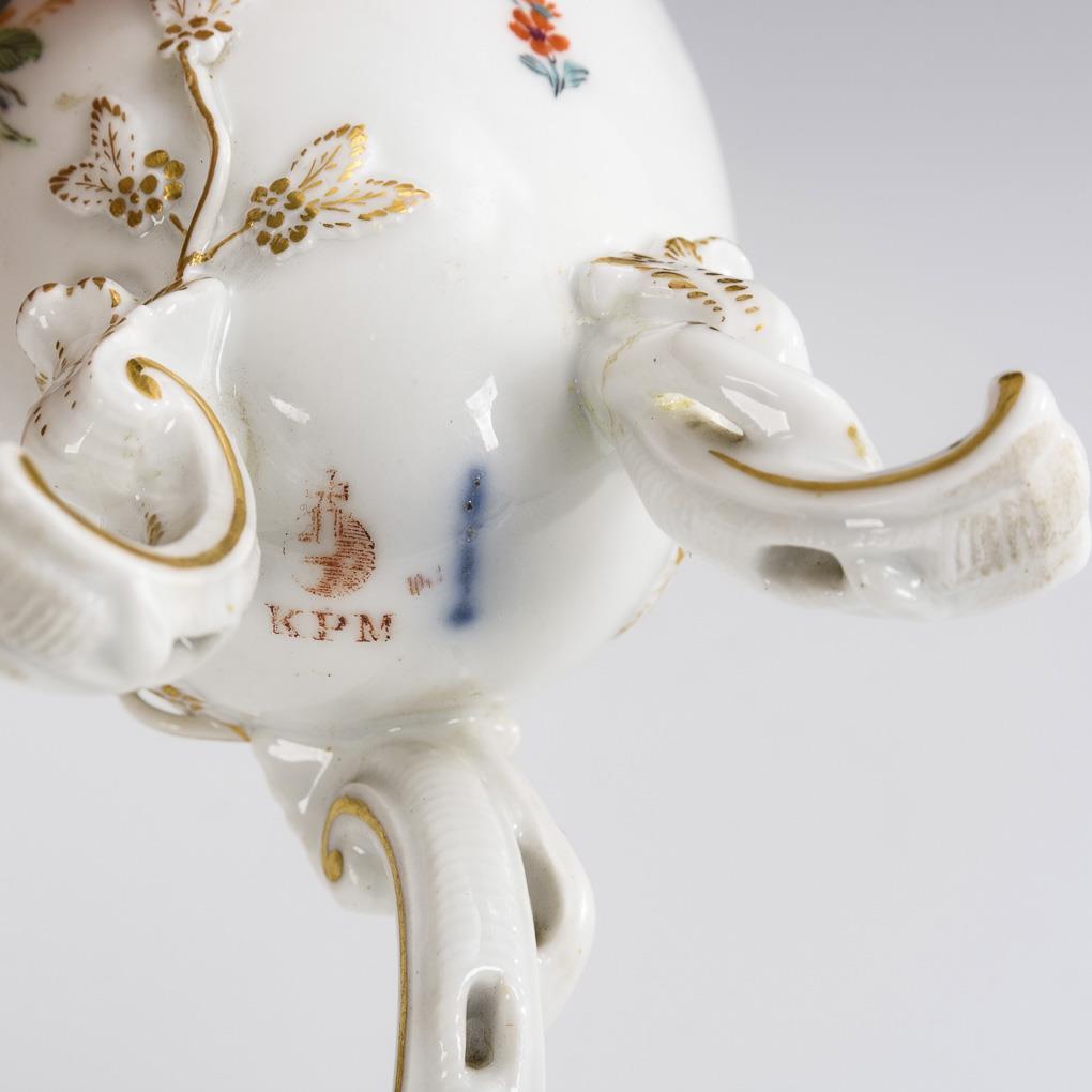 Ovoid body on three curved legs, floral knob lid. 1 foot glued.