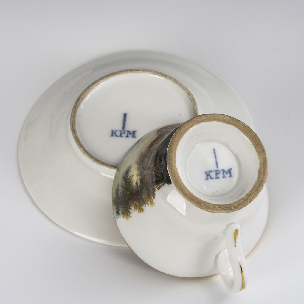 Polychrome painted, gold decorated. H cup 7,5 cm, Ø original saucer 15 cm.