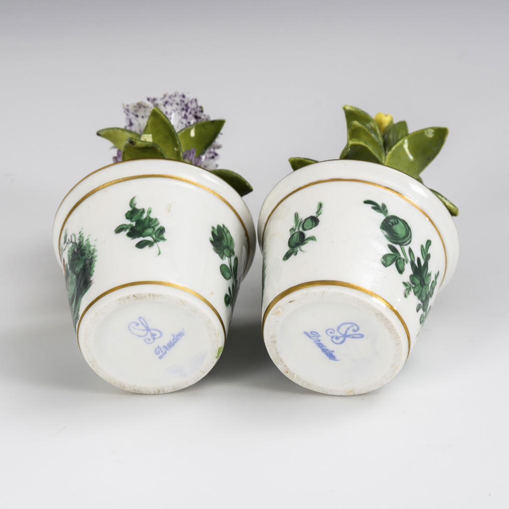 Tapered pots with sculpted flowers and copper green absorbent cotton painting on the front. 2 leaves restored1 flower minimally bumped.